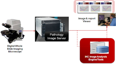 The image analysis batch process will access the image and perform the analysis. the analysis will be performed for the marked ROIs. algorithm will count the specific Biomarker from the image and store the report in the LMS. Finally the pathologist can access the report and perform the diagnosis/prognosis. Typically the image analysis is a time consuming process due to large image size. Hence very high end systems are required to perform the activity. IHC test results are most reliable for fresh or frozen tissue samples. IHC tends to be an unreliable test for tissue that’s preserved in wax or other chemicals. Many IHC analysis process conforms to CPT codes for computer-aided quantification of prognostic markers which will increase reimbursement opportunities. Examples of IHC scoring tools are