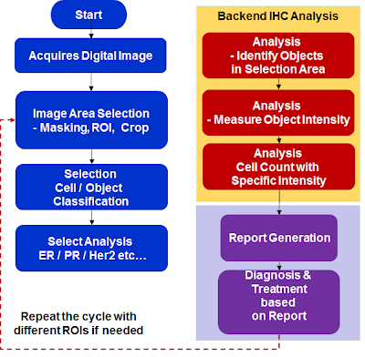 The pathologist has to select the Region of Interest(ROI) during the using the proper image editing viewer software. Pathologist can select multiple ROIs in a single slide. Based on the primary investigation inputs, perform the cell classification and then decide on the specific analysis based on the analysis. Pathologist can select single/multiple algorithms depends on the bio marker to be counted say analysis for Her2, EP, PR etc. The selected image and corresponding settings shall be will be stored in the image storage/LMS.