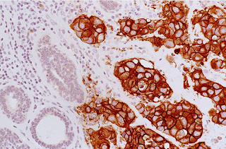 HER2 is a membrane stain from which the pathologist assesses the intensity and completeness of the membrane staining of the tumor cells and determines a score of 0, 1+, 2+ or 3+ for the slide. HER2 is used specifically to determine the aggressiveness of breast tumors and to assess Herceptin® (Trastuzumab) as a treatment option. ER and PR are nuclear stains from which the pathologist assesses the staining intensity of the nuclei of the tumor cells and determines the percentage of positive stained nuclei as a percentage between 0 to 100% and the average staining intensity of the positive nuclei as a score of 0, 1+, 2+ or 3+.